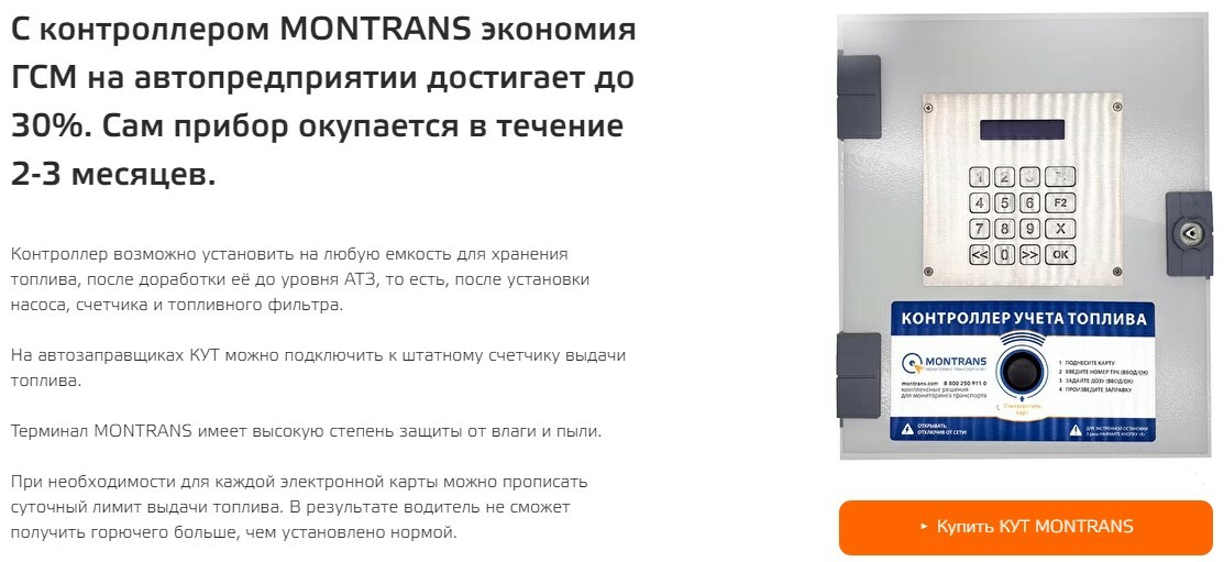 «ДУТ является одним из основных элементов системы спутникового мониторинга транспорта. Показания датчиков интегрируются в автоматизированную программу управления автопарками. MONTRANS.ONLINE сегодня является самым эффективным способом учета топлива на предприятиях любой сферы деятельности. Облачный сервис делает прозрачным движение топлива в автопарке, снимая головную боль у владельца бизнеса. Сервис мониторинга пресекает попытки сливов и помогает снизить затраты на покупку топлива. Общая экономия средств может достигать до 30%».